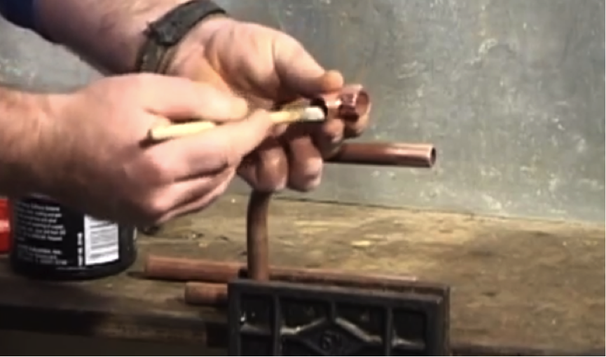 To begin, secure the pipe to be joined in a vice. If you don’t have a vice, then use a heatproof surface. Never solder without the proper protection.