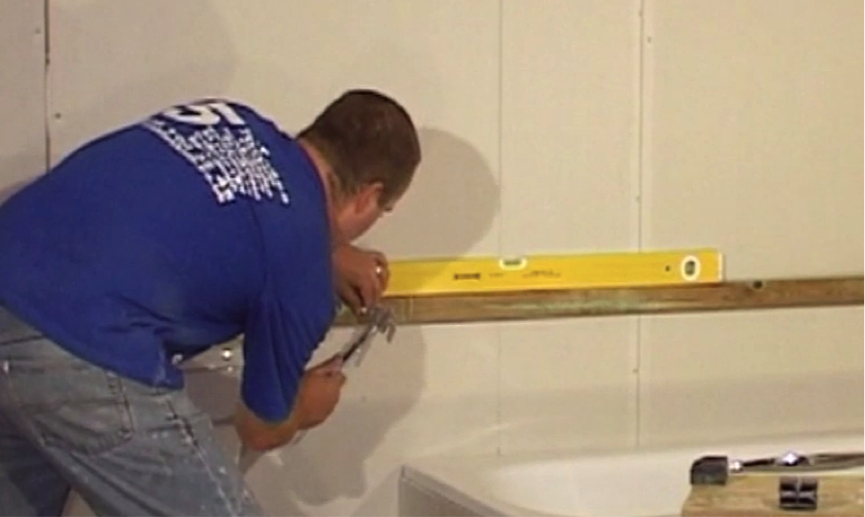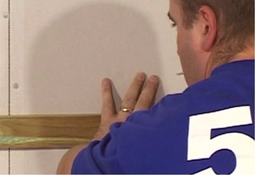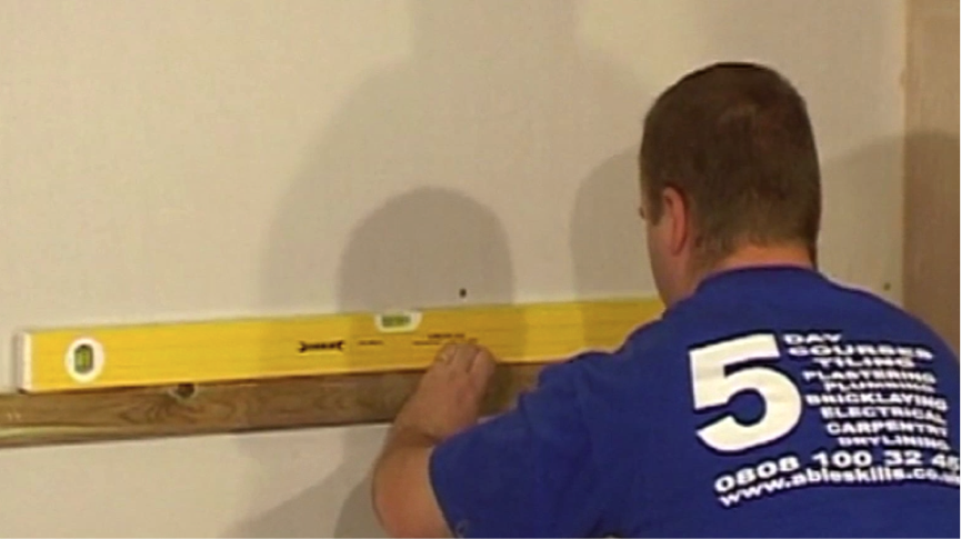 The baton is either screwed or nailed to the wall along a horizontal line already drawn with pencil. Use your spirit level to make sure it is straight and check that it is flush along the wall.