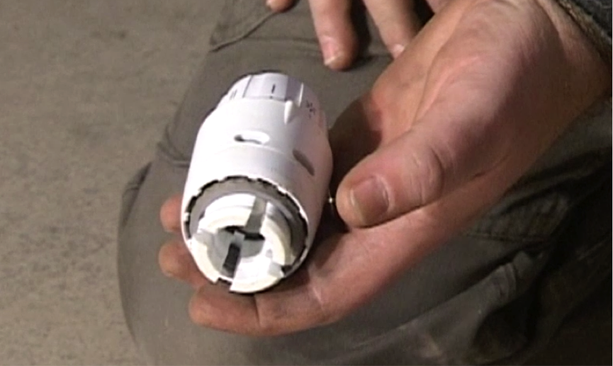 Take the large plastic head that comes with it. Inside there is expanding liquid or gas containing metal bellows. It is heat sensitive and designed to pick up the ambient temperature of the room. As the room reaches the right temperature, the bellows expand, push down on a piston, which closes the valve and turns off the radiator.