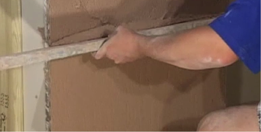 The feather edge is used to rule off the undercoat, making it level with the beading you have set. The feather edge has two distinct sides, one flat and other tapered to an edge. With the thin edge to the wall, rest it on your beads and with your hands underneath the feather edge, run it up the wall in a straight line. Make sure the feather edge stays on the beads to rule it off square.