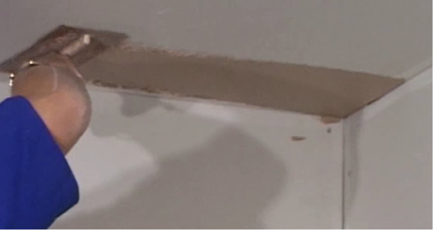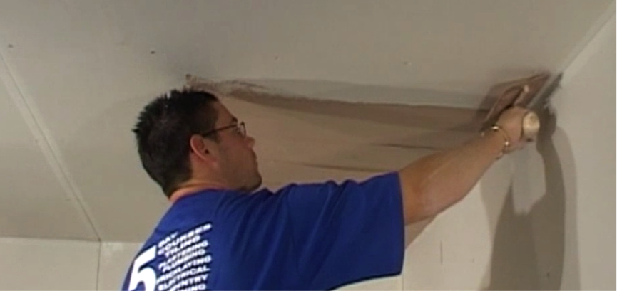 As soon as your first coat is finished, proceed straight away to remove the excess plaster ridges, including lumps or holes. To close the plaster in, start with the trowel in an even an open position and as you bring towards you, slowly close it off and remove. Repeat across the whole ceiling.