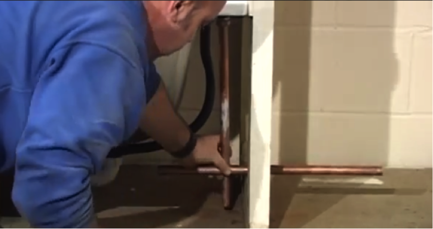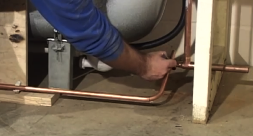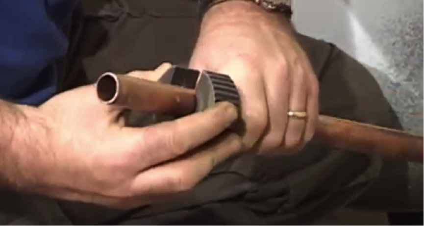 Using the mark as your guide, use your pipe cutter for a smooth and straight cut. With the model shown, push the pipe in and turn on the direction of the arrow marked on the cutter. Other models are available so read the instructions carefully.