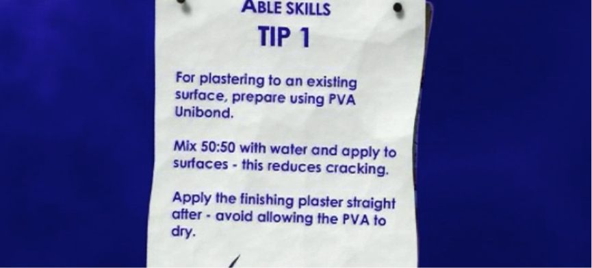 - When plastering to an existing surface, prepare it using PVA unibond mixed with water. Apply this to surfaces to stop cracks appearing. NB Always apply plaster straight after PVA application, do not allow it to dry