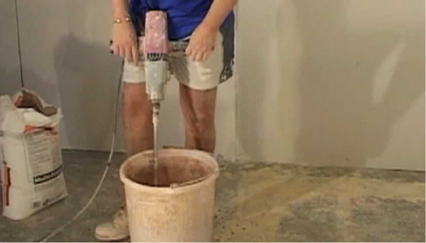 Taking your drill and paddle, start mixing up the contents. Make sure you do this thoroughly and reach the parts that are left lumpy or dry.