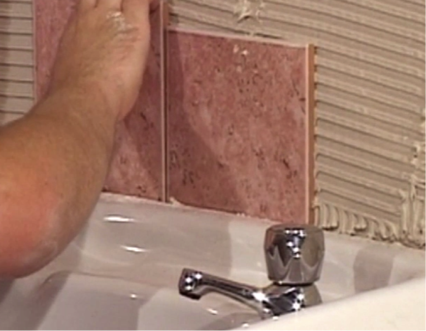 Using the centre line, run a tile down the back of the sink and press firmly into place.