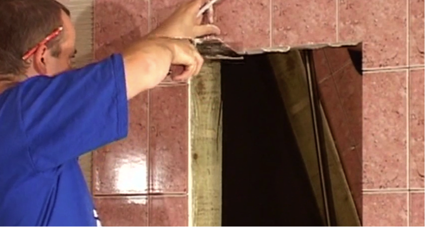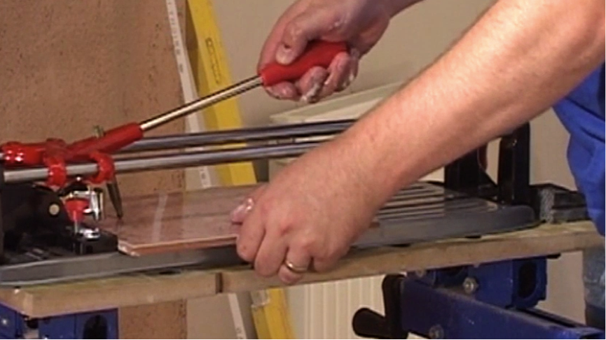 These can be a little tricky. Take a tile with the correct depth, place it on the tile on the frame below and then spin it 180 degrees so the cut edge is now facing you. Glide it up to cover the part to be tiled and mark with a pencil how much tile needs removing – allowing room for a spacer.