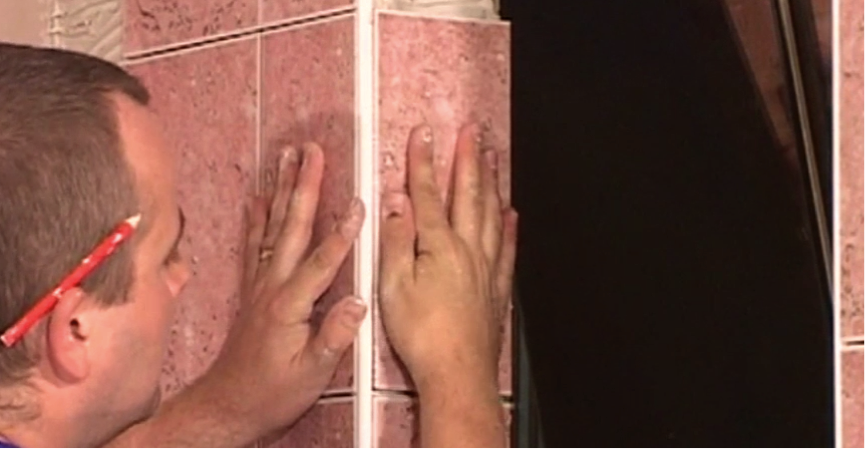 - Remember, if it is going up against a wall already tiled, like pictured, you don’t leave room for a spacer on the wall side, for a flush finish