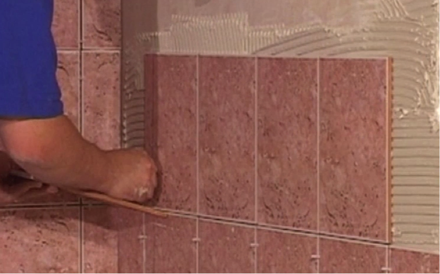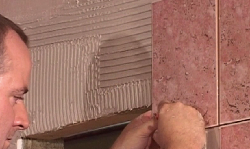 Go back to spreading your adhesive. Remember that you’re looking for a nice, even grill-like pattern on the wall. These channels mean air can flow and increases the suction that holds tiles to the wall. Getting the right trowel angle when applying is very important for this – it should be between 35 and 45 degrees.