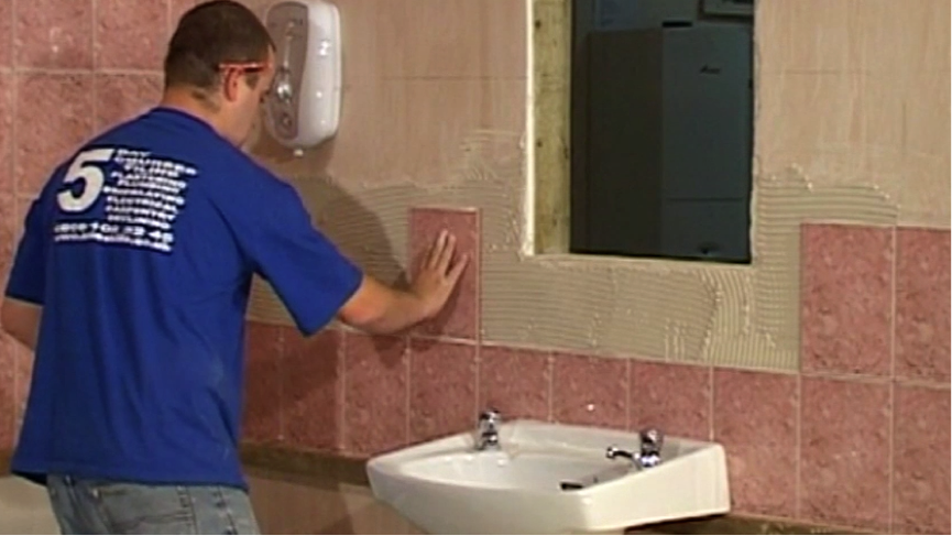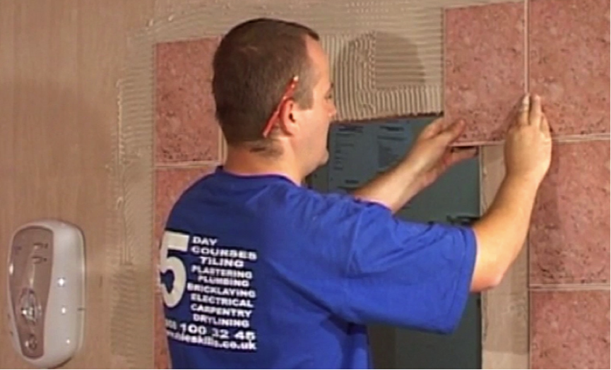 Fix the tile onto the wall and repeat on the other side of the window space. Now do the same for the cut tiles down the sides of the windows, until you fill in all the gaps. Then clean the tiles before moving on to the trim.